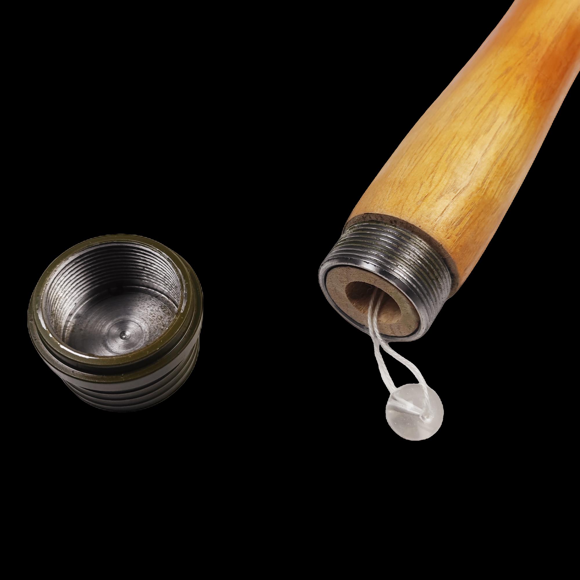 可以看到木柄带有拉火绳。并又带有螺纹的保险盖保护着