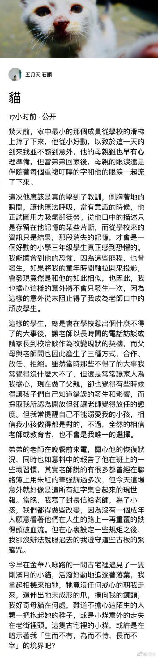 据台媒报道,近日五月天石头在脸书发文,称自己小儿子日前在学校从滑梯上摔下来,以侧胸着地,曾一度无法呼吸,所幸最后没事。