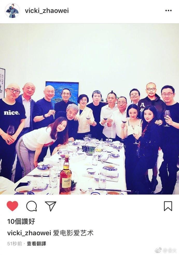 4月22日,赵薇在ins晒出与周迅、张艺谋、冯小刚、李少红、田壮壮等多位电影人共同聚餐的合影,并配文:“爱电影爱艺术。”